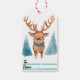 Une étiquette de cadeau de Noël fantaisiste présente un renne souriant orné d'une écharpe confortable, entouré d'arbres enneigés, parfait pour ajouter un charme festif à vos cadeaux de fêtes.