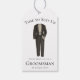 Pour une façon moins commune de faire une proposition de toiletteur. Dans la partie supérieure se trouve un élégant costume à l'ancienne. Au-dessus du costume se trouve le texte voûté "Il est temps de s'adapter". En dessous du costume se trouve le texte : "Votre service en tant que Groomsman est demandé". Tout le texte est en casquette noir et peut être modifié. L'arrière - plan est du papier kraft brun. Le costume vintage, approprié pour un mariage de cravate blanc - smoking noir, pantalon noir, chemise blanche, cravate arc blanc, gilet blanc (gilet bas coupé) - est tiré d'une poupée en papier vintage de 1910, "La famille de papier Lettie Lane", maintenant dans le domaine public.