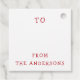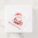 Noël à partir de étiquettes-cadeaux avec l'illustration d'un Père Noël mignon tenant une boîte-cadeau avec le texte "Joyeux Noël" dans une police rouge, lunatique ci-dessous. Ajoutez votre nom à l'arrière.