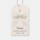 Complete your First Holy Communion celebration with these elegant round favor tags featuring a luxurious ivory bow with delicate pearl details and a subtle gold cross.