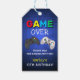 Étiquette de remerciement de fête d'anniversaire de jeu personnalisée cool. Super amusant et coloré, avec un fond pixel bleu, le texte "FIN DU JEU !", deux manettes de jeu vidéo, message de remerciement, nom et âge.