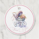Balises de faveur ronde baby shower mignonne, avec des graphiques d'un joli bébé buggy avec des fleurs et des arcs et une jante rose, autour du bord. Personnalisez le texte personnalisé rose selon vos besoins. Idéal sur les faveurs de baby shower ou sur les prix spéciaux de jeu de baby shower.