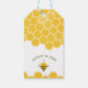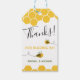 Nos étiquettes de cadeau d'abeilles à l'aquarelle remercient vos invités d'être "passés" à votre événement ou à votre baby shower sur le thème des abeilles. Le design présente une bordure asymétrique à motif de nid d'abeille jaune qui est répétée au verso, une typographie script amusante et des lettres majuscules modernes en vert, jaune et noir. #Bourdons #Remerciements #FavorisDeFête