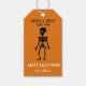 Jolis tags personnalisés avec squelette sur fond de citrouille orange pour friandises d'Halloween.