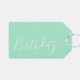 Cette étiquette cadeau moderne et élégante comporte du texte blanc Happy Birthday sur le côté avant et sur le côté arrière personnalisez-le avec votre nom ou votre nom de famille. L'arrière - plan est de couleur menthe.