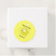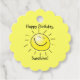 Ensemble de 12 étiquettes de faveur à pétoncles avec l'image d'un soleil jaune souriant sur le texte jaune et facultatif. Le dos est jaune. Consultez la collection complète des étiquettes de cadeaux et de faveurs d'anniversaire dans la section PARTY FAVORS.