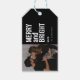 Tags de cadeau photo personnalisés de vacances tendance avec une typographie minimaliste moderne citent "joyeux et lumineux" et votre nom de famille sur un arrière - plan noir qui peut être changé à n'importe quelle couleur. Un design minimaliste et contemporain unique et qui se démarquera en cette période de vacances !