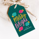 Balises de cadeaux de vacances mignonnes et colorées avec la phrase "Joyeux + Lumineux" sur le devant en or, turquoise, lettrage rose à la main contre un arrière - plan turquoise. De jolies ampoules de Noël entourent le texte en rose chaud et turquoise avec des bases dorées. Personnalisez l'avant des étiquettes cadeaux de vacances modernes en ajoutant votre nom en texte blanc. L'arrière est habillé d'un solide arrière - plan turquoise ou d'une couleur de votre choix. Conçu pour coordonner avec notre collection Joyeux et Lumières de Noël.
