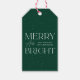 Étiquettes cadeaux de Noël modernes avec "Joyeux et lumineux" en lettres blanches et arrière - plan vert avec des points blancs subtils. Personnalisez les étiquettes cadeaux de vacances vertes avec votre salutation personnalisée et votre nom de famille.