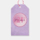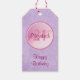 Une étiquette cadeau d'anniversaire. Design à thème d'anniversaire. Un joli cercle rose tient votre nom customisé et votre âge. L'arrière - plan est une lavande pastel pâle violet. Élégant et chic.