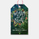 Joyeux et brillant / Joyeux Noël et Joyeux Noël et Joyeux Nouvel An Tags cadeaux de fête - Typographie Texte, fleurs de Poinsettia, branche d'arbre de pin et baies rouges de Mistletoe.