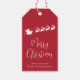 Des étiquettes cadeau de fête rouge avec une silhouette blanche de rennes volant Père Noël traînent à travers l'air, "Joyeux Noël" dans un script blanc élégant et votre nom dans une simple typographie blanche moderne.