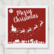Cette marque-cadeau de Noël rouge festif présente la silhouette de Père Noël en train de son traîneau avec ses rennes, volant au-dessus des maisons dans une traînée d'étoiles sur un arrière - plan rouge festif. Le texte des deux côtés est entièrement personnalisable.