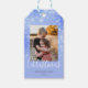 Cette étiquette cadeau photo de Noël simple moderne comporte des flocons de neige sur un arrière - plan lilas bleu doux. Joyeux Noël est écrit dans une belle écriture manuscrite. Personnalisez cette étiquette cadeau avec votre photo et votre nom de famille.