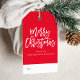 Offrez à vos forfaits vacances un facteur wow avec des étiquettes cadeaux de vacances modernes. Les étiquettes de cadeaux de vacances personnalisées comportent "Joyeux Noël" dans une police de script tendance, un arrière - plan rouge vif, et un motif de pin à l'arrière du design.