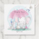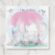 Un éléphant mignon est assis dans l'herbe tenant un parapluie à pois rose tandis qu'un oiseau bleu vole parmi de jolies gouttes de pluie en forme de cœur rose. Il y a un petit chaton heureux avec un papillon bleu posé sur sa tête. Étiquette cadeau parfaite pour vos cadeaux de douche bébé. "Merci d'avoir inondé notre bébé d'amour"