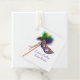 Ensemble de 12 étiquettes de faveur carrés avec l'image d'un beau masque satin violet, vert et or sur un bâton avec des plumes et des rubans coordonnant les couleurs, et l'expression "Laissez Les Bon Temps Rouler !" (Laissez le Bon Temps Rouler) en écriture violette en français sur blanc. Le dos est blanc avec du texte personnalisable. Voir sac de faveur, autocollant rond et autocollant vinyle cousu sur mesure. Voir la collection Mardi Gras Favor & Gift Tag dans TOUCHES SPÉCIALES | Section Favoris.