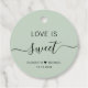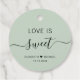 Étiquettes-cadeaux chic sauge vert pour vos faveurs de mariage avec "l'amour est doux" dans un mélange de lettres simples et d'un script élégant, vos noms unis par un coeur et votre date mariage.