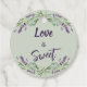 Un arrière - plan moderne vert sauge décoré de fleurs de lavande, de verdure d'eucalyptus. Avant : L'amour est doux Retour : Merci, et ajoutez vos noms. Pour les faveurs sucrées comme le chocolat, les biscuits.