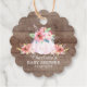 Balise de faveur baby shower mignonne avec citrouilles roses avec bouquet floral aquarelle sur un arrière - plan rustique en faux bois.