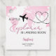 Ce design présente un baby shower à thème aventure "Un petit explorateur est à l'atterrissage bientôt" avec une carte du monde couleur rose et un petit avion mignon sur la route. Le thème minimaliste et moderne du baby shower de filles.