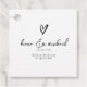 Une police de caractère audacieuse et décorative attire immédiatement l'attention et donne le ton à la plupart des pièces de cette suite mariage moderne et minimaliste. L'étiquette de faveur de mariage, en noir sur blanc, présente un modèle pour ajouter facilement un message de remerciement personnel, vos noms et la date du mariage. Une forme de coeur dessinée à la main sur l'avant et florale sur l'arrière ajoutent des accents amusants supplémentaires. Recherchez ID940 pour voir tous les produits de ce jeu de mariages.