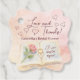 Remerciez vos invitées de la douche nuptiale avec ces jolis étiquettes de faveur. Le design amusant de livre de contes présente une aquarelle rose et pêche d'un livre avec une rose unique et une bague de fiançailles en or équilibrée dans les pages ouvertes formant une ombre en forme de cœur. La légende du livre indique : Un nouveau chapitre commence ! Le titre se lit Love and Thanks avec des cœurs romantiques dispersés !