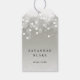 Les étiquettes à accrocher chic pour votre entreprise comprennent du lettrage noir classique sur un arrière - plan gris argenté orné d'un éclat de lumières de livres blanches en haut. Personnaliser avec deux lignes de texte personnalisé en dessous. Les blocs sont en blanc solide pour le texte personnalisé ou le message manuscrit supplémentaire.