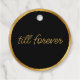 Cette étiquette de faveur élégante est belle. Le design présente un bord doré mince et minimaliste. Design a une typographie dorée pour le message de Merci personnalisable, les noms des jeunes mariés et la date du mariage dans le devant, texte personnalisé jusqu'à toujours dans le dos. Arrière - plan noir sur mesure pour assortir votre décoration à thème mariage blanc et or.