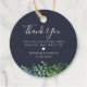 Arrangement de feuillage de forêt aquarelle rustique, étiquettes de remerciement. L'étiquette comporte des fonds de couleur bleu marine uni et du texte blanc.
