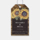 Personnalisez une étiquette cadeau unique pour vos faveurs de mariage avec un ensemble d'étiquettes cadeaux Rustic Sunflower Mariage. Le design de l'étiquette-cadeau comprend un trio de tournesols aquarelle contre un arrière - plan rustique en bois. Personnalisez avec les noms du marié et de la mariée avec la date du mariage. Papier à lettres mariage supplémentaire disponible avec cette conception aussi.