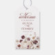 Les étiquettes de bienvenue Boho mariage de automne sont ornées de fleurs sauvages d'aquarelle rustique, d'un citrouille et d'un élégant modèle texte facile à personnaliser.