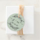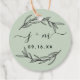 Étiquette de faveur verte terreuse rustique avec feuilles de laurier, initiales de script et date moderne.
