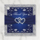 Ces étiquettes de remerciement de mariage carrés sont de couleur bleu marine et argent profond avec un ruban image à travers le centre sur le devant avec des fleurs en soie au-dessus et au-dessous du ruban. Au centre se trouve une paire de bijoux et simulé parties scintillant joint coeurs broch. Le dos est en gris avec des fleurs bleu marine et un texte personnalisable qui dit, "merci de partager notre journée spéciale avec nous !" avec le nom de la mariée et du marié et leur date de mariage.