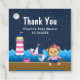 Cette étiquette de faveur mignonne et amusante comporte un singe marin sur un pont en bois avec une mouette et un crabe. Dans l'arrière - plan il y a un phare rose et blanc, un oiseau mignon sur un voilier, des vagues de l'océan et un ciel étoilé bleu marine. Le texte combine des polices audacieuses et serif pour un look élégant et moderne. Parfait pour un baby shower à thème nautique.