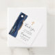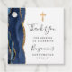 Cette étiquette de remerciement de confirmation est dotée d'une aquarelle bleu marine ornée d'une parties scintillant en faux or. Une fausse croix de feuille d'or apparaît au-dessus des mots "Merci" dans le script d'écriture manuscrite gris charbon sur un arrière - plan blanc. Personnalisez-le avec le nom de l'invité d'honneur, l'occasion et la date dans la fonte grise fusain.