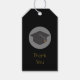 Une étiquette cadeau de remerciement conçue avec une casquette noire de graduation avec un cercle semi-transparent derrière. Arrière - plan noir avec lettrage or est simple mais élégant.