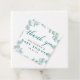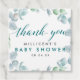 Un remerciement moderne pour vos faveurs de baby shower, avec des feuilles d'eucalyptus aquarelle en bleu et vert. 'Merci' est en vert turquoise. police lettrée. Personnalisez avec les détails de l'événement.