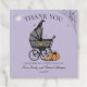 Balise de faveur "Merci" Halloween/Automne Baby shower personnalisé, avec chariot de bébé dessiné à la main, corneille et citrouilles contre un arrière - plan pastel violet. Idéal pour la décoration de sacs et boîtes de faveur. Cliquez simplement sur "Personnalisez ce modèle" pour insérer votre propre message de Merci, nom et date de l'événement.
