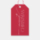 This elegant yet modern holiday gift tag features red calligraphy script over a white background. The greeting says "Merriest Christmas". All colors of this design are customizable. See the collection for alternate greetings and coordinating items.
