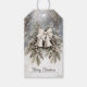 This Christmas gift tag features a vintage style illustration of silver bells tied with a ribbon, framed by a wreath of pine, holly, and berries under falling snow. The front reads Merry Christmas in classic script, and the back includes lines for To and From. A timeless and elegant way to finish your gifts, perfect for those who love traditional holiday details with a graceful winter feel.