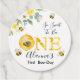 Fleur Miel Abeille Premier Jour d'Abeille Favor Tags Sweet bumble ou miel abeille thème de premier anniversaire marque de faveur avec un arrangement floral principalement jaune, quatre mignonettes abeilles et un nid d'abeille.