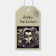"Happy Halloween" en écriture vintage et élégante. Au-dessous de l'accueil, une caricature d'encre complexe d'un homme qui dégage un mélange unique d'influences gothiques et steampunk, avec son costume pointu orné de détails mécaniques subtils et un monocle rehaussant son expression énigmatique.