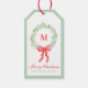 Grandmillennial Preppy Christmas Wreath Monogram Tags cadeaux avec un arc rouge. Texte modifiable, customisez pour créer le vôtre.