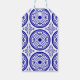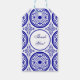 Une étiquette de remerciement personnalisée avec un motif original en faux carreaux d'inspiration delft en bleu et blanc avec des rouleaux ornés.sur les bords et un centre avec un motif gothique de croix et de feuilles.