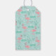 Des étiquettes cadeaux avec un motif fantaisiste. Flamants roses pastel sur un arrière - plan vert clair. Plaquettes de lis vert et fleurs de lotus. Jolie ambiance tropicale.