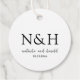 Les étiquettes de faveur de mariage modernes avec un design simple et minimaliste noir et blanc avec votre monogramme en caractères gras avec vos noms dans un élégant script d'écriture et votre date de mariage dans une police serif. Le dos a votre message de remerciement personnalisé.