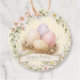 Ces étiquettes-cadeaux de Pâques présentent un nid avec des œufs de Pâques ornés de fleurs. Les couleurs utilisées incluent le vert olive, la crème, le rose blush, le violet et le marron.