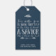 Christian Christmas Verse Typographie Gite Tags avec Luke 2:11 en typographie festive sur un arrière - plan bleu rustique, avec des fleuris pittoresques de branches de pin blanc et de cônes de pin.
