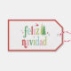 Ce tag ludique présente le dicton "Feliz Navidad" avec alternance de couleurs et coordination de bandes autour du bord. Les couleurs sont rose, rouge, vert et bleu clair.